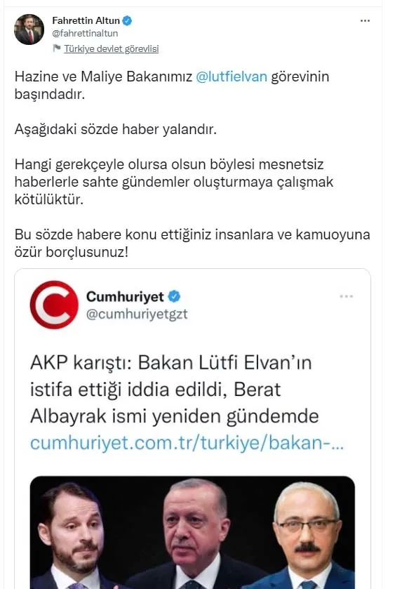 Cumhuriyet'te yer alan asılsız haberle ilgili açıklamada bulunan İletişim Başkanı Fahrettin Altun, "Hazine ve Maliye Bakanımız Lütfi Elvan görevinin başındadır. Aşağıdaki sözde haber yalandır. Hangi gerekçeyle olursa olsun böylesi mesnetsiz haberlerle sahte gündemler oluşturmaya çalışmak kötülüktür. Bu sözde habere konu ettiğiniz insanlara ve kamuoyuna özür borçlusunuz!" dedi.
