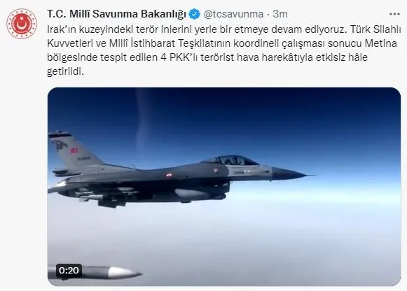 Terörle mücadele hız kesmeden sürüyor. Son dakika haberine göre Milli Savunma Bakanlığı sıcak bir gelişmeyi duyurdu. Bakanlıktan yapılan açıklamada "Irak'ın kuzeyindeki terör inlerini yerle bir etmeye devam ediyoruz. Türk Silahlı Kuvvetleri ve Millî İstihbarat Teşkilatının koordineli çalışması sonucu Metina bölgesinde tespit edilen 4 PKK'lı terörist hava harekâtıyla etkisiz hâle getirildi." ifadelerine yer verildi.