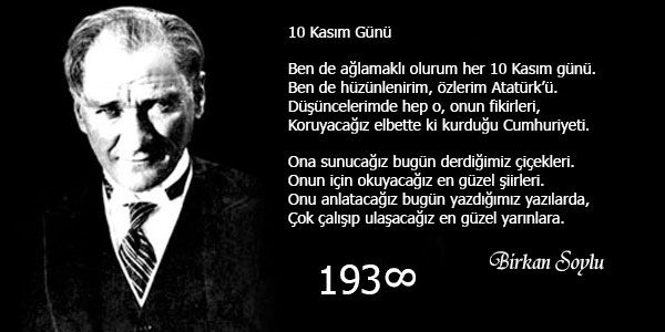 Türkiye Cumhuriyeti'nin kurucu Ulu Önder Atatürk'ün çok sevdiği ülkesine ve hayata veda ettiği gündür 10 Kasım. 1938 yılı 10 Kasım günü saat 9'u 5 geçe aramızdan ayrılan Atatürk o gün çeşitli etkinliklerle anılır. 10-16 Kasım haftası; onun yurtseverliği, inkılap ve ilkelerinin anlatıldığı, radyo ve televizyonda Atatürk'ün konuşmalarının kendi sesinden dinletildiği, Atatürk'le ilgili filmlerin gösterildiği Atatürk'ün anıldığı hafta olarak Türk halkı tarafından kutlanır. Atatürk'ün aramızdan ayrılığı gün, Anıtkabir ziyaret edilir, Ankara'da resmi tören yapılır. Her 10 Kasım'da Türkiye'de yaşam durur ve bayraklar yarıya indirilir.