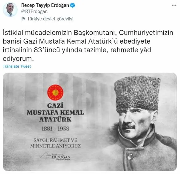 "Aziz Atatürk, zatıalinizi vefatınızın 83. seneidevriyesinde bir kez daha rahmetle yad ediyoruz. Kurduğunuz ve bizlere emanet ettiğiniz Cumhuriyetimizi, müstevlilerin emellerine dahil olan bedhahlara rağmen büyütmeye, kalkındırmaya, bölgesinin ve dünyanın parlayan yıldızı yapmaya devam ediyoruz. Eğitim, sağlık, güvenlik, sanayi başta olmak üzere her alanda elde ettiğimiz tarihi başarılarla 2023 hedeflerimize kararlılıkla ilerliyoruz. Ülkemizin bütünlüğüne, devletimizin bekasına, necip milletimizin birliğine, dirliğine ve kadim değerlerine kastedilmesine asla izin vermeyeceğiz. Ruhun şad olsun."