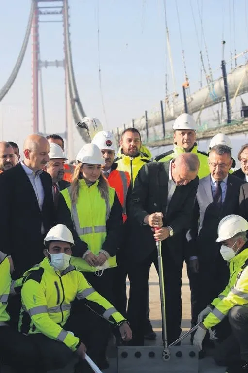 1915 Çanakkale Köprüsü Son Tabliye Yerleştirme Töreni'ni gerçekleştirdiklerini kaydeden Başkan Erdoğan, "Köprü inşaatında önemli bir aşamayı daha geride bıraktık. İnşallah, önümüzdeki yılın en geç 18 Mart'ında, yani Çanakkale Deniz Zaferimizin 106'ncı yıl dönümünde köprümüzü ve Malkara'ya kadar uzanan 101 kilometrelik otoyolu hizmete açacağız. İstanbul Havalimanı'ndan yola çıkıp Yavuz Sultan Selim Köprüsünden Anadolu istikametine devam ettiğinizde de Osmangazi Köprüsü Bursa-Susurluk hattıyla yine Savaştepe'ye ve İzmir'e ulaşılabileceksiniz. Artık 3 kıtadaki tüm kara, deniz, demir, hava yollarının ülkemizden ve elbette boğazlarımızdan geçmeye başladığı bir döneme giriyoruz." dedi.