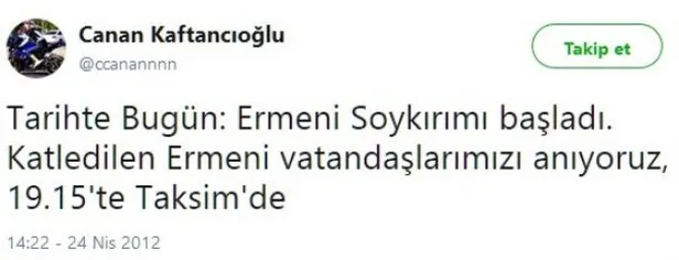 Kaftancıoğlu'nun geçmişte yaptığı sözde Ermeni soykırımı paylaşımlarını hatırlatarak, "Bu arada her ne kadar, maratonlarda tişörtlerde 1919, 1923 varsa da, Sayın Çelebi'nin dediği gibi zihinlerde 1915 var. O nedenle 1915 Ermeni soykırımı ile de 'yüzleşilmeli', helalleşilip kucaklaşılmalı. Herhalde 1919 Canan Hanım'ı kıracak halleri yok." dedi.