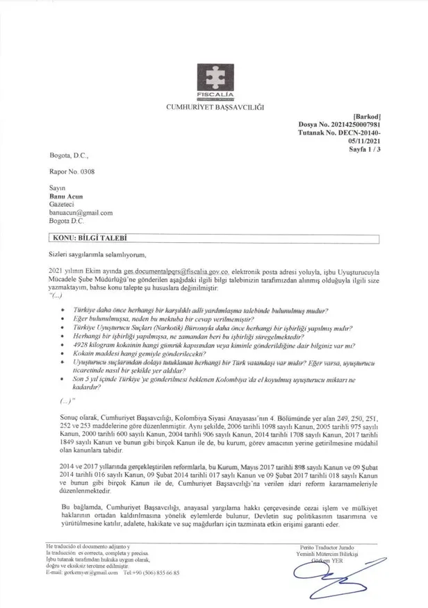 Kolombiya narkotik biriminden alındığı söylenen İspanyolca belgede, 22/09/2021 tarihinde Türkiye'ye adli istinabe talebinde bulunulduğuna ilişkin bir ifade yer almamaktadır.