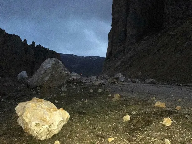 Deprem anında sarsıntının etkisiyle Hınıs-Köprüköy kara yoluna kaya parçaları düştü.