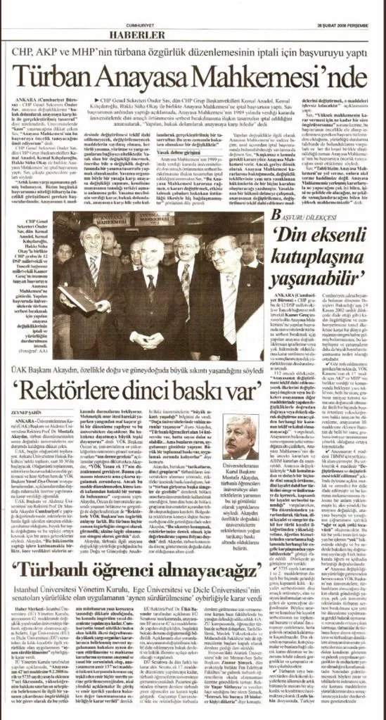 AK Parti iktidarı ise üniversitelerde başörtüsüne serbestlik getiren Anayasa değişikliğini 9 Şubat 2008 tarihlerinde Türkiye Büyük Millet Meclisi'nde 518 milletvekilinin katıldığı oylamada 411 olumlu, 103 olumsuz oyla kabul ettirdi. Sabah'ta yer alan habere göre, 27 Şubat 2008 yılında ise CHP ve DSP, üniversitelerde başörtüsüne serbestlik getiren yasanın iptali için Anayasa Mahkemesi'ne başvurdu.