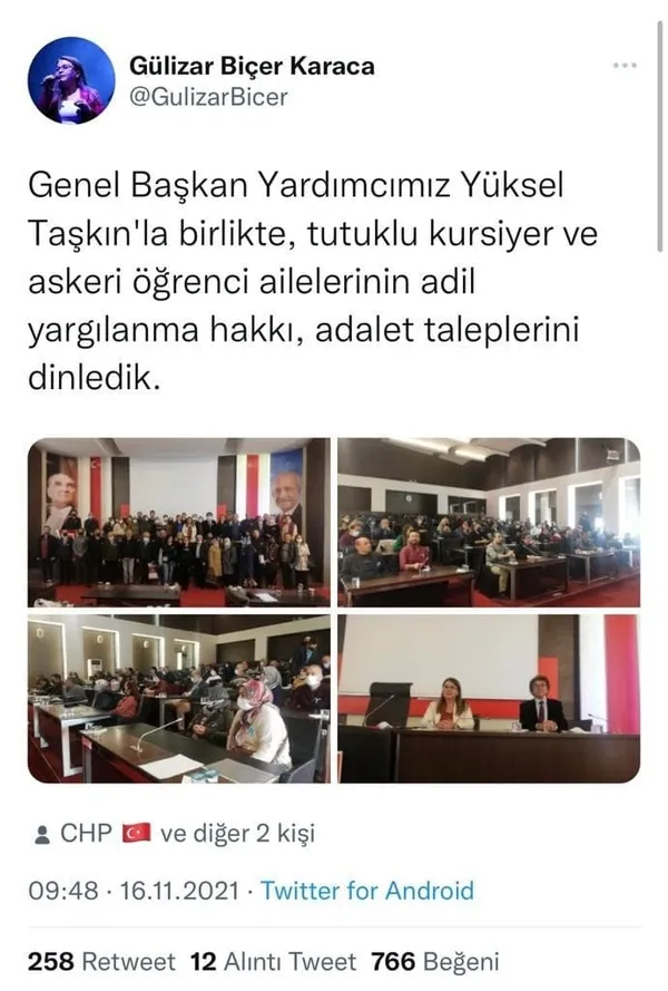Gülizar Biçer Karaca; sosyal paylaşım sitesi Twitter'daki resmi hesabından açıklamada bulundu ve "Genel Başkan Yardımcımız Yüksel Taşkın'la birlikte, tutuklu kursiyer ve askeri öğrenci ailelerinin adil yargılanma hakkı, adalet taleplerini dinledik" ifadelerini kullandı.