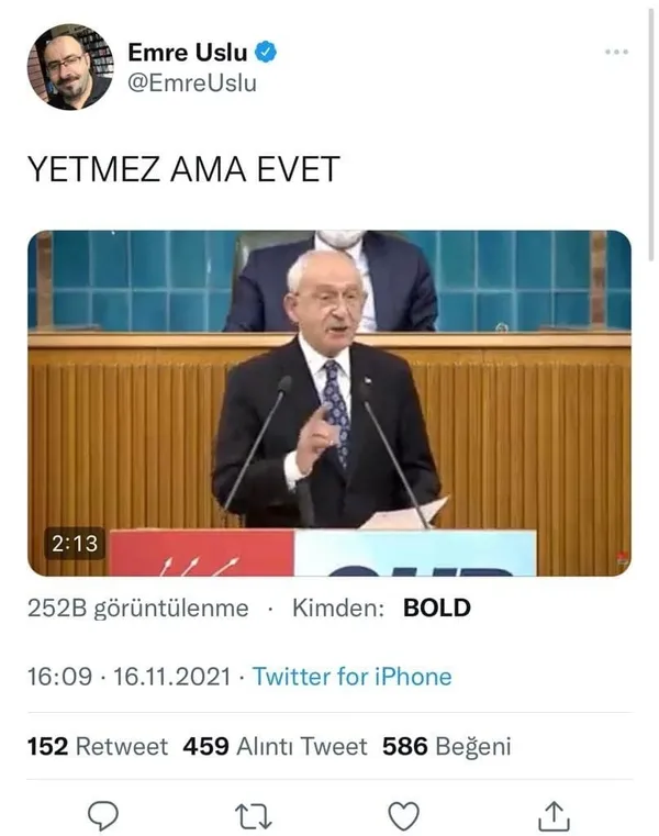 16 Kasım 2021- ABD'nin Virginia eyaletinde yaşayan Fetullahçı Terör Örgütü'nün kara kutusu Emre Uslu; Kemal Kılıçdaroğlu'nun "Mahkemelerde süründürülen askerlerimiz ve aileleriyle helalleşeceğiz" şeklindeki açıklaması hakkında değerlendirmede bulundu ve "Yetmez ama evet" ifadelerini kullandı