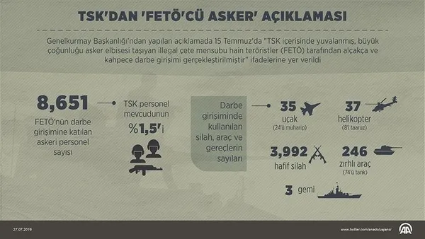 27 Temmuz 2016: Genelkurmay Basın ve Halkla İlişkiler Daire Başkanlığından Fetullahçı Terör Örgütü'nün (FETÖ) 15 Temmuz'daki darbe girişimine 8 bin 651 askeri personelin katıldığı, bu sayının TSK'nın personel mevcudunun yüzde 1,5'ine tekabül ettiği bildirildi. Açıklamada, FETÖ'nün darbe girişimine 8 bin 651 personel katıldı. Bunların bin 676'sını erbaş ve erler, bin 214'ünü askeri öğrenciler oluşturdu. Açıklamada darbe girişiminde 24'ü muharip olmak üzere, 35 uçak, 8'i taaruz olmak üzere, 37 helikopter, 74'ü tank olmak üzere, 246 zırhlı araç ve 3 gemi kullanıldığı kaydedildi.