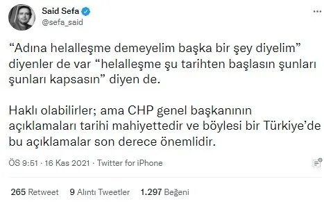 Said Sefa; " 'Adına helalleşme demeyelim başka bir şey diyelim' diyenler de var 'helalleşme şu tarihten başlasın şunları şunları kapsasın' diyen de. Haklı olabilirler; ama CHP genel başkanının açıklamaları tarihi mahiyettedir ve böylesi bir Türkiye'de bu açıklamalar son derece önemlidir.