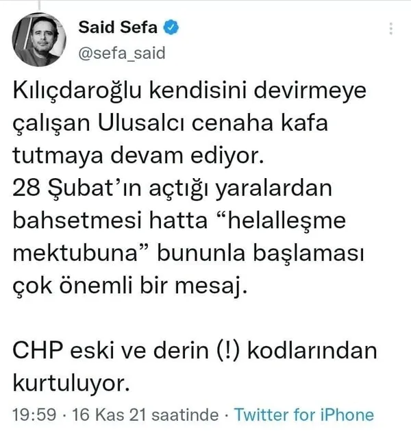 Kılıçdaroğlu kendisini devirmeye çalışan Ulusalcı cenaha kafa tutmaya devam ediyor. 28 Şubat'ın açtığı yaralardan bahsetmesi hatta 'helalleşme mektubuna' bununla başlaması çok önemli bir mesaj. CHP eski ve derin (!) kodlarından kurtuluyor" ifadelerini kullandı.