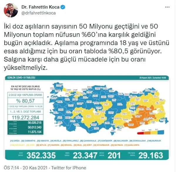 Tabloya ilişkin uyarı yapan Bakan Koca, "İki doz aşılıların sayısının 50 Milyonu geçtiğini ve 50 Milyonun toplam nüfusun %60'ına karşılık geldiğini bugün açıkladık. Aşılama programında 18 yaş ve üstünü esas aldığımız için bu oran tabloda %80,5 görünüyor. Salgına karşı daha güçlü mücadele için bu oranı yükseltmeliyiz." ifadelerini kullandı.
