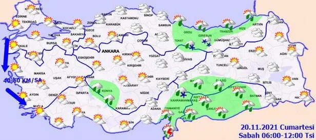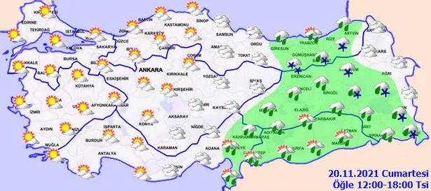 Son dakika hava durumu.... Meteorolojiden 20 Kasım Cumartesi günü beklenen hava durumuna ilişkin tahminler geldi. Buna göre, sıcaklıklar 4 dereceye kadar azalırken, Doğu Karadeniz ile Doğu Anadolu'nun bazı kesimlerden kar yağışı etkili olacak. Ayrıca doğu Karadeniz ve Akdeniz ile Doğu Anadolu ve Güneydoğu Anadolu'da sağanak yağış bekleniyor. İşte 20 Kasım Cumartesi hava durumu...