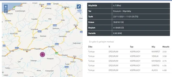 Afet ve Acil Durum Yönetimi Başkanlığı (AFAD), merkez üssü Erzurum'un Köprüköy ilçesi olan 4,7 büyüklüğünde deprem meydana geldiğini bildirdi. AFAD'ın internet sitesinde yer alan bilgiye göre, saat 11.31'de, merkez üssü Erzurum'un Köprüköy ilçesi olan 4,7 büyüklüğünde sarsıntı kaydedildi.