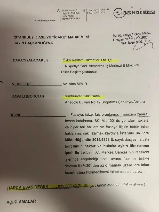 "Herkesin bir 'öykü'sü vardır cancağzım:) Para İçin mekana dava açıp mekana sahip belirlediğini zannetmek gibi!" mesajıyla paylaşılan söz konusu belgede, Özkan'ın sahibi olduğu "Öykü Reklam Hizmetleri A.Ş" adına CHP'ye 832 bin 500 TL'lik dava açıldığı görülüyor. Belgeye göre Öykü Reklam Hizmetleri A.Ş, alacakları nedeniyle CHP'ye icra takibi başlatıyor. CHP takibe itiraz ediyor. Bunun üzerine Öykü'nün sahibi Necati Özkan, itirazın iptali için dava açıyor.