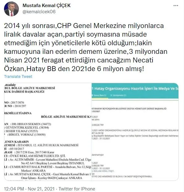 Çiçek, "2014 yılı sonrası, CHP Genel Merkezi'ne milyonlarca liralık davalar açan, partiyi soymasına müsade etmediğim için yöneticilerle kötü olduğum; lakin kamuoyuna ilan ederim demem üzerine, 3 milyondan Nisan 2021'de feragat ettirdiğim cancağzım Necati Özkan, Hatay BB'den 2021'de 6 milyon almış!" ifadelerini kullandı.