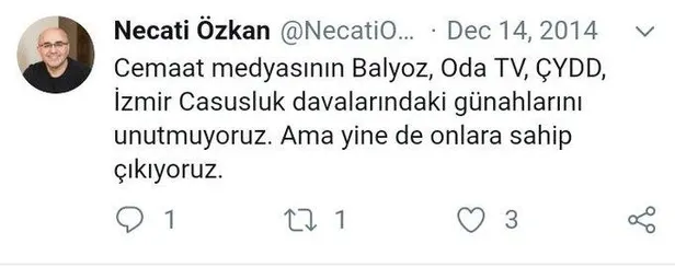 Özkan'ın geçmişinde de peşini hiç bırakmayacak skandal paylaşımları var. FETÖ kumpaslarına destek veren, FETÖ'nün kapatılan yayın organlarına sahip çıkan Özkan, 26. Genelkurmay Başkanı Org. İlker Başbuğ'un tutuklanmasını da savunmuştu. Özkan, Zaman gazetesine yönelik operasyonların ardından gazeteye destek eylemlerine katılmıştı.