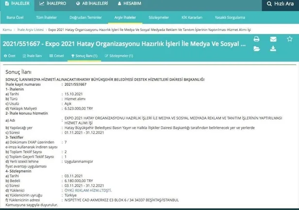 CHP'li Hatay Büyükşehir Belediyesi'nin sosyal medya ihalesiyle ilgili ortaya çıkan belgede, ihaleyi İmamoğlu'nun sağ kolu ve imaj danışmanı Necati Özkan'ın sahibi bulunduğu Öykü Ajans'ın aldığı görülüyor.