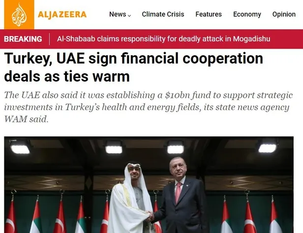 Ankara ile Abu Dabi arasındaki ilişkilerin geliştiğini yazan El Cezire, iki ülkenin finansal iş birliği anlaşmaları imzaladığını okurlarına duyurdu.