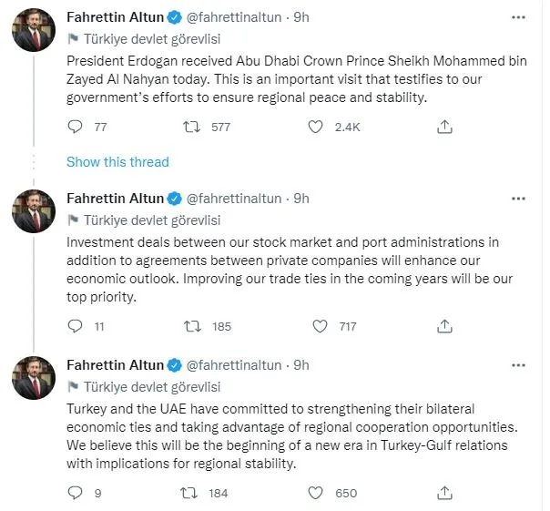 Başkan Erdoğan'ın Nahyan'ı kabul ettiğini kaydeden Altun, "Bu ziyaret, devletimizin bölgesel barış ve istikrarı tesis etmeye yönelik çabalarını kanıtlayan önemli bir ziyaret oldu. Ticaret, enerji ve çevre alanlarında imzalanan ikili anlaşmalar ekonomik ilişkilerimizi geliştirecektir. Ayrıca, bu anlaşmaların çok ihtiyaç duyulan iş birliği hedefini daha da ileriye taşımasını temenni ediyoruz. Türkiye bölgede istikrar ve barış için her zaman önemli bir güç olacaktır. Özel şirketler arasındaki anlaşmaların yanı sıra borsalarımız ve liman yönetimlerimiz arasındaki yatırım anlaşmaları da ekonomik profilimizi güçlendirecektir. Önümüzdeki yıllarda ticari ilişkilerimizi geliştirmek en büyük önceliğimiz olacaktır. Türkiye ve BAE, ikili ekonomik ilişkilerini güçlendirme ve bölgesel iş birliği fırsatlarından yararlanma hususlarında kararlıdır. Bunun, Türkiye-Körfez ilişkilerinde bölgesel istikrar açısından yeni bir dönemin başlangıcı olacağına inanıyoruz" dedi.