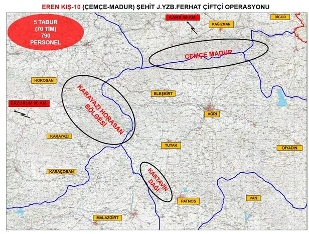 İçişleri Bakanlığı, Ağrı, Erzurum ve Kars'ta Eren Kış-10 Çemçe-Madur Şehit Jandarma Yüzbaşı Ferhat Çiftçi operasyonunun başlatıldığını bildirdi.