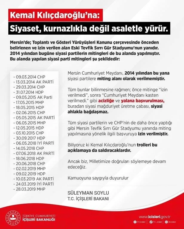 CHP ve Kemal Kılıçdaroğlu'nun iddialarına İçişleri Bakanı Süleyman Soylu da sert bir yanıt vererek gerçeği yansıtmadığını bildirmişti. Soylu, "Kemal Kılıçdaroğlu'na: Siyaset, kurnazlıkla değil asaletle yürür." şeklinde yaptığı Twitter paylaşımında, "Mersin Cumhuriyet Meydanı, 2014 yılından bu yana siyasi partilere miting alanı olarak verilmemiştir. Acizliğe ve yalana başvurulması ve siyasi mağduriyet üretme çabası, siyasi ahlakla bağdaşmaz" ifadelerine yer vermişti.