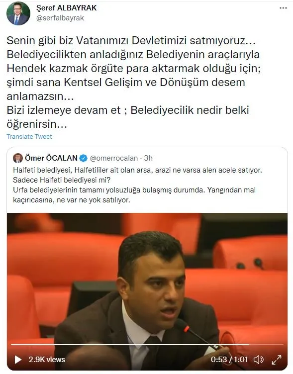 Terör örgütü elebaşı Abdullah Öcalan’ın yeğeni ve HDPKK Şanlıurfa Milletvekili Ömer Öcalan, Halfeti belediyesi'ni hedef alarak "Halfetililer ait olan arsa, arazi ne varsa alen acele satıyor. Sadece Halfeti belediyesi mi? Urfa belediyelerinin tamamı yolsuzluğa bulaşmış durumda. Yangından mal kaçırıcasına, ne var ne yok satılıyor." dedi. HDPKK'lı Öcalan'a ağzının payını veren Halfeti Belediye Başkanı Şeref Albayrak "Senin gibi biz Vatanımızı Devletimizi satmıyoruz... Belediyecilikten anladığınız Belediyenin araçlarıyla Hendek kazmak örgüte para aktarmak olduğu için; şimdi sana Kentsel Gelişim ve Dönüşüm desem anlamazsın... Bizi izlemeye devam et; Belediyecilik nedir belki öğrenirsin..." ifadelerini kullandı.