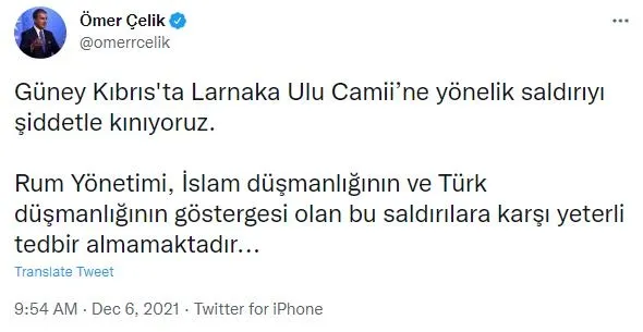 AK Parti Sözcüsü Ömer Çelik, Güney Kıbrıs'taki Larnaka Ulu Camii'ne yönelik saldırıyı kınayarak, "Kıbrıs Rum Yönetimi'ni bu alçakça eylemlerin tekrarlanmaması için acilen önlem almaya çağırıyoruz" dedi.