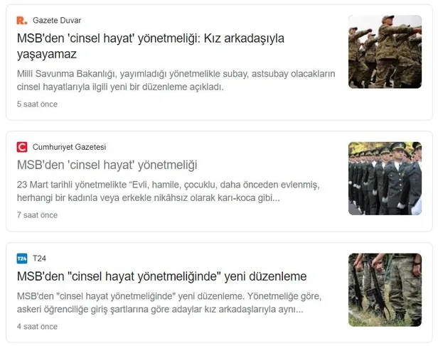 Milli Savunma Bakanlığı kaynakları, bazı internet sitelerinde, bugünkü Resmi Gazete'de yayımlanan yönetmelik değişiklikleriyle ilgili "MSB'den cinsel hayat yönetmeliği" başlıklı haberlere yer verildiğini belirtti.