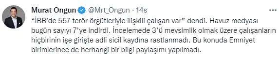 Daha sonra İBB sözcüsü Murat Ongun, sosyal medya üzerinden, "'İBB'de 557 terör örgütleriyle ilişkili çalışan var' dendi.