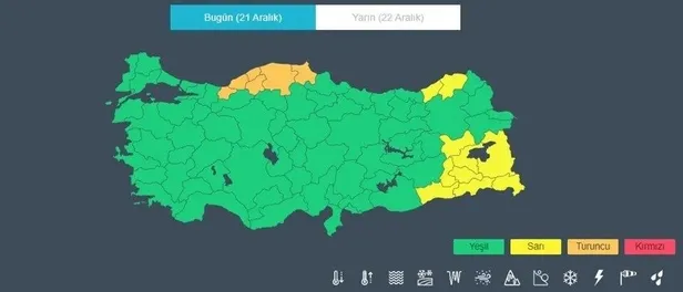Meteoroloji Genel Müdürlüğünden kar yağışıyla ilgili son dakika uyarılar geliyor. Kar yağışı beklenen 6 il için 'turuncu', karla karışık yağmur beklenen 10 il için de 'sarı kod'lu uyarı yaptı. Yapılan son değerlendirmelere göre, Doğu Anadolu'nun doğusunda kar yağışının yer yer yoğun olması beklendiğinden yüksek kesimlerin dik yamaçlarında çığ tehlikesi oluşma ihtimaline karşı vatandaşlar uyarıldı. Peki, İstanbul, Ankara ve İzmir'de bugün hava nasıl olacak? İstanbul'da kar yağacak mı? İşte il il 21 Aralık hava durumu raporu.