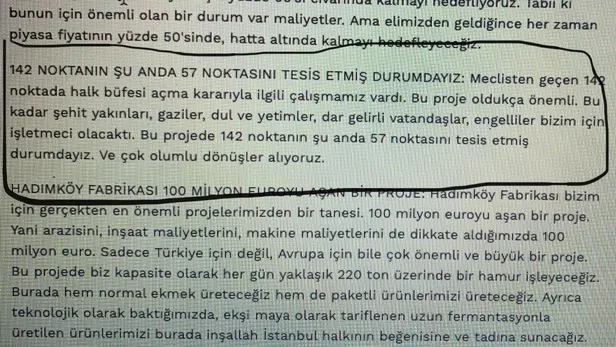 AK Parti döneminde Halk Ekmek A.Ş.'nin 2016 yılında günlük 2.1 milyon ekmek ürettiği, CHP'li Ekrem İmamoğlu döneminde ise ekmek üretiminin günlük 1.6 milyona düşürüldüğü bildirildi. İBB'nin 85 noktada halk ekmek büfesi açma yetkisinin olduğu ancak 11 aydır 85 büfenin açılmadığı bildirildi.