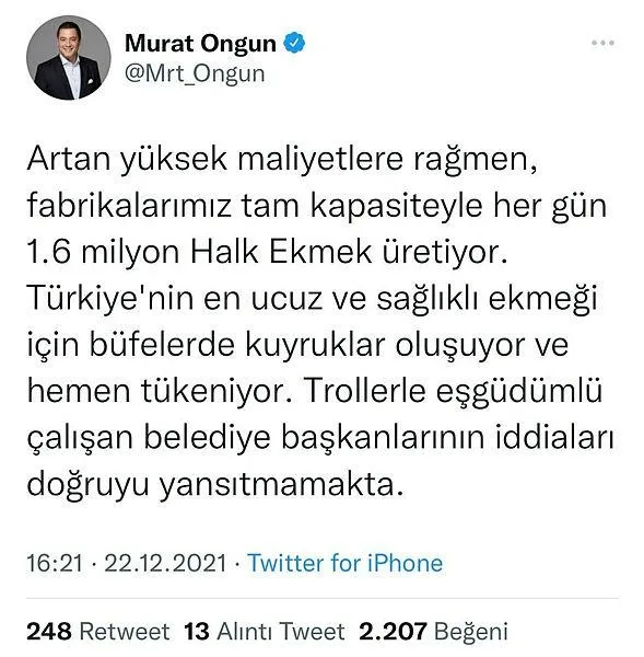 Sabah'ta yer alan habere göre, AK Parti döneminde Halk Ekmek A.Ş.'nin 2016 yılında günlük 2.1 milyon ekmek üretildiği bildirildi. İBB Sözcüsü Murat Ongun, 22 Aralık 2021 tarihinde sosyal paylaşım sitesi Twitter'daki resmi hesabından yaptığı açıklamada "Artan yüksek maliyetlere rağmen, fabrikalarımız tam kapasiteyle her gün 1.6 milyon Halk Ekmek üretiyor" iddiasında bulunmuştu.