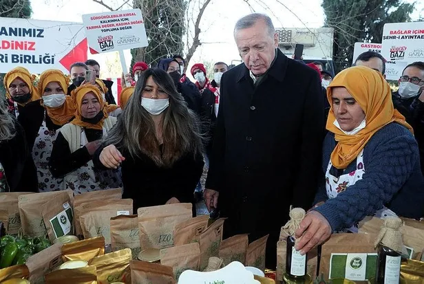 Erdoğan, ziyarette ürünlere ilişkin bilgi aldı, kadınlarla hatıra fotoğrafı çektirdi.