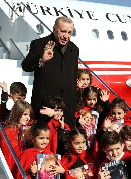 Başkan Erdoğan, havalimanında kendisini karşılayanlar arasında yer alan çocuklara hediye verdi, fotoğraf çektirdi.