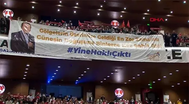 (Salondaki pankart) Gençlik, ilginç bir noktayı yakalamış, "Gölgelerin üzerimize geldiği en zor zamanda güneşin doğuşuna binlerce kez şahit olduk. Yine haklı çıktın."