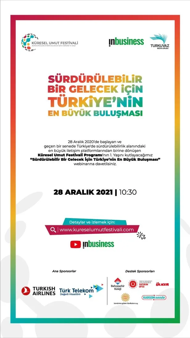 Turkuvaz Medya Grubu tarafından ekonomi dergisi InBusiness öncülüğünde başlatılan, sürdürülebilirlik konusunda farkındalık oluşturma misyonu taşıyan Küresel Umut Festivali’nin “Büyük Buluşması” 28 Aralık 2021’de online olarak gerçekleştirilecek.
