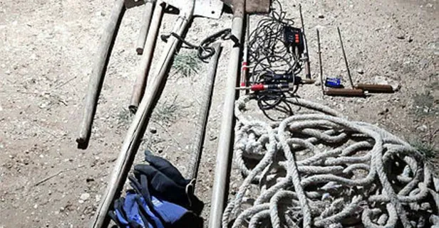 Olay yerinde yapılan aramada 1 dedektör, 4 arama aparatı, 1 pil, 1 kulaklık aparatı, 2 kürek, 2 çapa, 1 keser, 1 murç, içerisine dedektör konulan 1 torba, 4 çift eldiven, 12 metrelik ip ele geçirildi.
