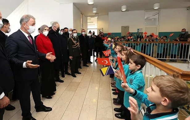 Milli Savunma Bakanı Hulusi Akar, Saraybosna'daki Maarif Vakfı Okulu'na yaptığı ziyarette çocukların söylediği şarkılarla ve "Plevne Marşı" ile karşılandı.