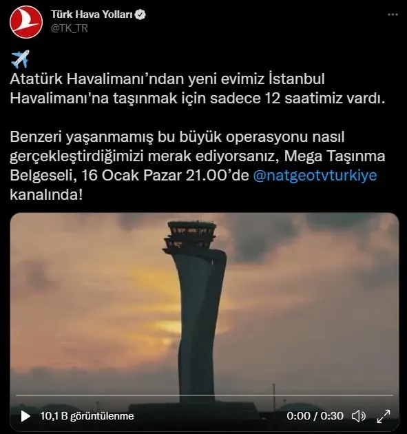 Türk Hava Yolları (THY) 12 saat içinde Atatürk Havalimanı'ndan İstanbul Havalimanı'na taşınma hikâyesi olan Mega Taşınma Belgeselinin 16 Ocak Pazar 21.00'de National Geographic Türkiye kanalında yayınlanacağını açıkladı.
