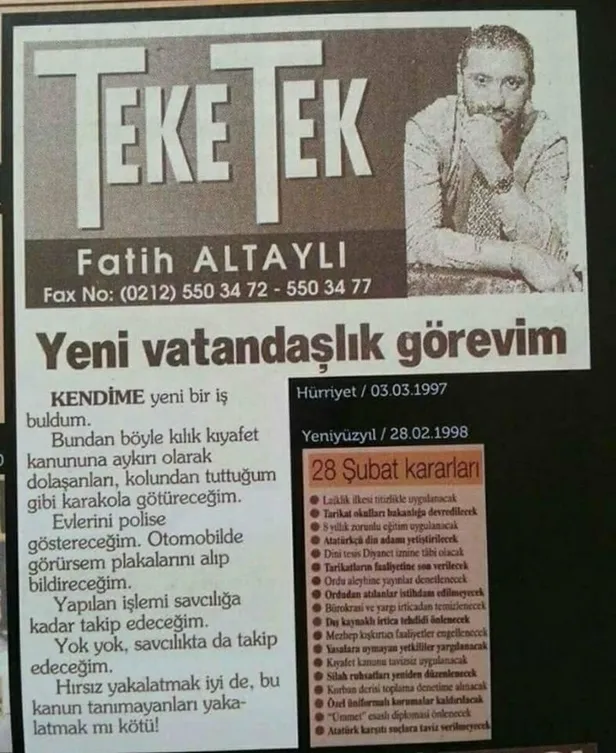 Öte yandan yine aynı Fatih Altaylı, 3 Mart 1997 tarihindeki "Yeni vatandaşlık görevim" başlıklı yazısında yine başörtülü kadınları kast ederek "Kendime yeni bir iş buldum. Bundan böyle kılık kıyafet kanununa aykırı olarak dolaşanları, kolundan tuttuğum gibi karakola götüreceğim. Evlerini polise göstereceğim. Otomobilde görürsem plakalarını alıp bildireceğim. Yapılan işlemi savcılığa kadar takip edeceğim. Yok yok, savcılıkta da takip edeceğim. Hırsız yakalatmak iyi de, bu kanun tanımayanları yakalatmak mı kötü?" satırlarını kaleme almıştı.