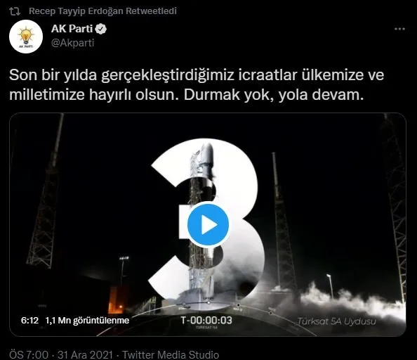 Başkan Recep Tayyip Erdoğan 2022'ye girmeye sayılı saatler kala sosyal medya hesabından bir paylaşım yaparak 2021 yılında imza attıkları projeleri sıraladı. Projelerde maddi ve manevi birçok alanda Türkiye'yı kalkındırmak için yapılan icraatler paylaşıldı.