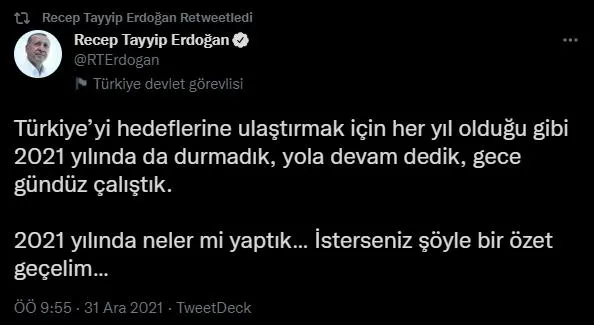 Başkan Recep Tayyip Erdoğan, sosyal medya hesabından "Türkiye'yi hedeflerine ulaştırmak için her yıl olduğu gibi 2021 yılında da durmadık, yola devam dedik, gece gündüz çalıştık. 2021 yılında neler mi yaptık… İsterseniz şöyle bir özet geçelim…" paylaşımı yaptı.