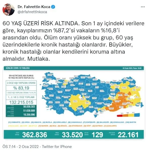 Sağlık Bakanı Fahrettin Koca, "60 YAŞ ÜZERİ RİSK ALTINDA. Son 1 ay içindeki verilere göre, kayıplarımızın %87,2'si vakaların %16,8'i arasından oldu. Ölüm oranı yüksek bu grup, 60 yaş üzerindekilerle kronik hastalığı olanlardır. Büyükler, kronik hastalığı olanlar kendilerini koruma altına almalıdır. Mutlaka." ifadelerini kullandı.