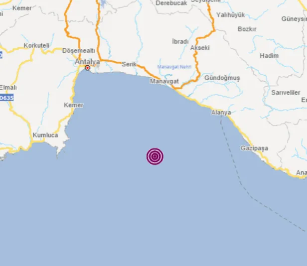 Deniz yüzeyinin 39,52 kilometre derinliğindeki depremin merkez üssünün Alanya'ya 56,92 kilometre mesafede olduğu belirlendi.