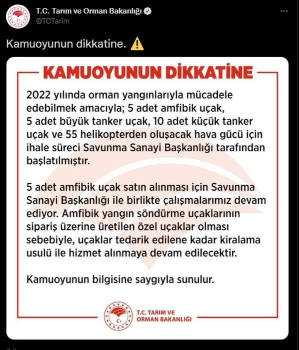Tarım ve Orman Bakanlığı'nın sosyal medyadan yaptığı açıklamada, "2022 yılında orman yangınlarıyla mücadele edebilmek amacıyla; 5 adet amfibik uçak, 5 adet büyük tanker uçak, 10 adet küçük tanker uçak ve 55 helikopterden oluşacak hava gücü için ihale süreci Savunma Sanayi Başkanlığı tarafından başlatılmıştır." ifadelerine yer verildi.