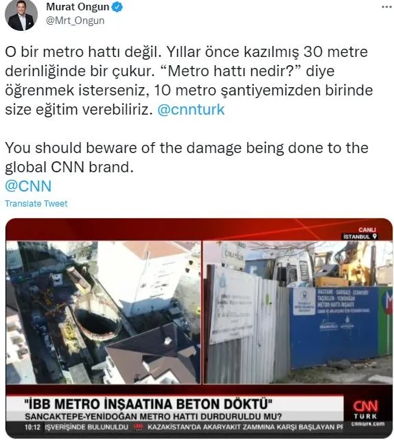 CHP'li İBB'nin Sözcüsü tepkilerin ardından sosyal medya hesabından bir açıklama yaptı. Ongun, Twitter'dan yaptığı paylaşımda "O bir metro hattı değil. Yıllar önce kazılmış 30 metre derinliğinde bir çukur." ifadelerini kullandı.