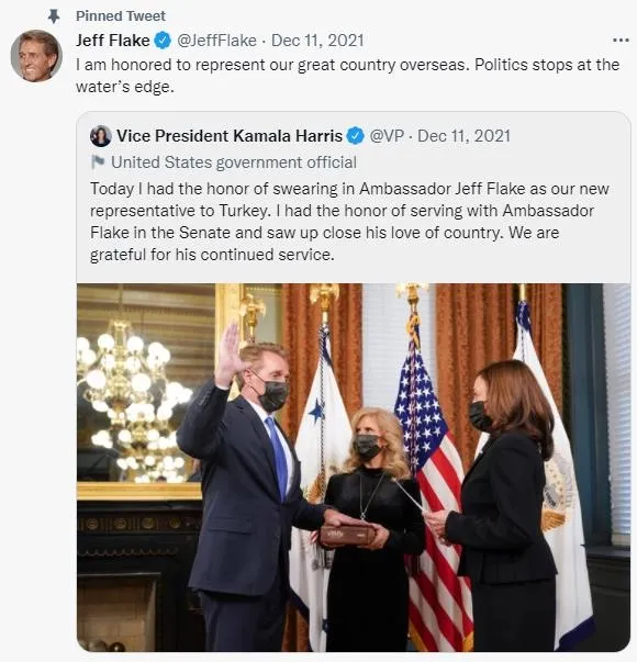 ABD Başkanı Joe Biden tarafından ABD'nin Ankara Büyükelçiliğine aday gösterilen ve adaylığı ekimde Senato'da onaylanan Flake, 11 Aralık 2021'de ABD Başkan Yardımcısı Kamala Harris'in huzurunda yemin etmişti.