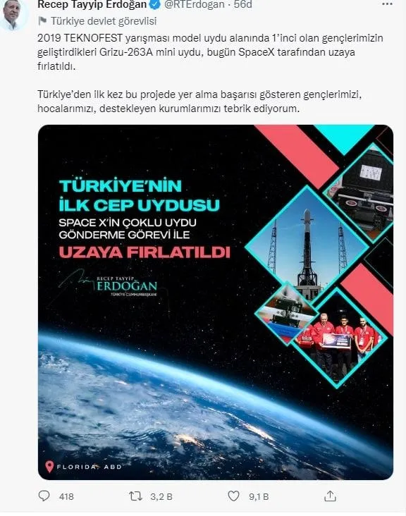 Başkan Recep Tayyip Erdoğan, Twitter hesabından yaptığı bir paylaşım ile tebrik mesajı gönderdi. Başkan Erdoğan paylaşımında "2019 TEKNOFEST yarışması model uydu alanında 1'inci olan gençlerimizin geliştirdikleri Grizu-263A mini uydu, bugün SpaceX tarafından uzaya fırlatıldı. Türkiye'den ilk kez bu projede yer alma başarısı gösteren gençlerimizi, hocalarımızı, destekleyen kurumlarımızı tebrik ediyorum." ifadelerine yer verdi.