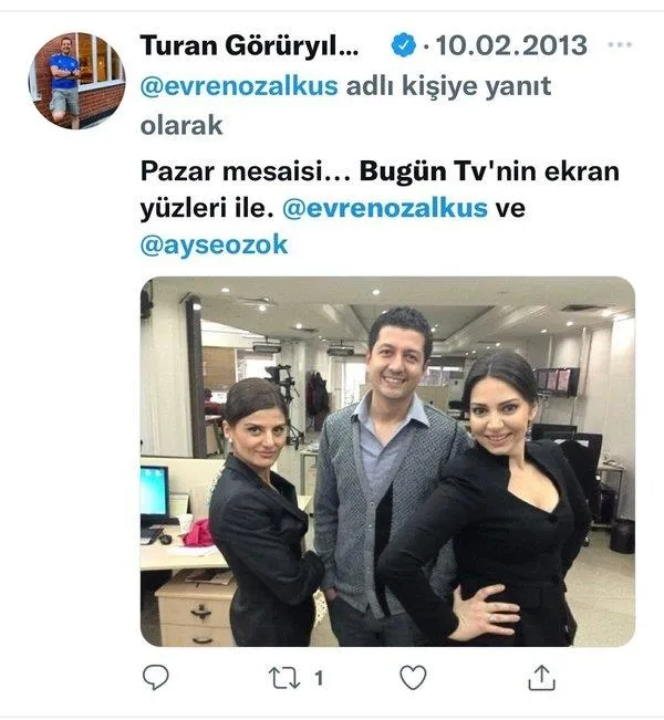Örgütün kapatılan televizyon kanallarında çalışan FETÖ firarisi Turan Görüryılmaz, 17-25 Aralık darbe girişimi sırasında attığı bir tweet'te Evren Özalkuş ile fotoğrafını paylaşıp "Bugün TV'nin ekran yüzleri ile" yazarak, tweet attı.