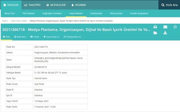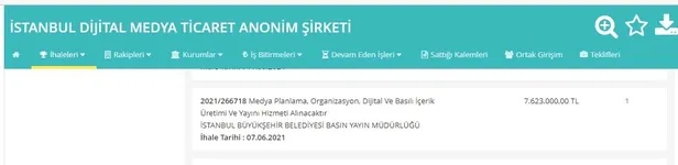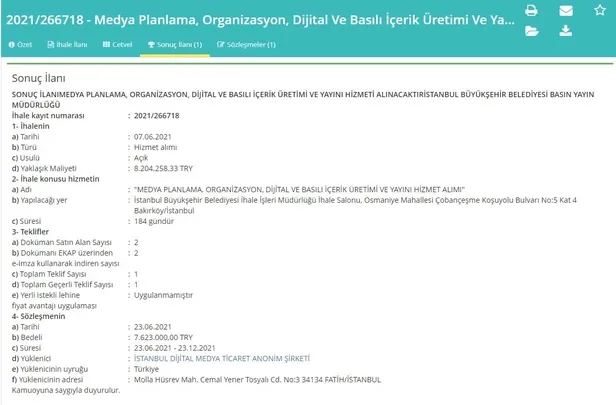 İhalenin daha sonra 7 milyon 623 bin TL olarak Murat Ongun kontrolündeli İstanbul Dijital Medya Ticaret Anonim Şirketi'ne verildiği görülüyor.